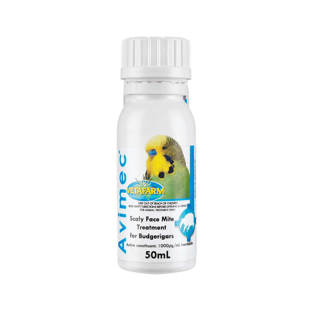 Scaly Face Mites burrow under the skin of the featherless areas of budgerigars causing severe damage and deformities to the beak, cere and eyelids. Avimec is a safe and effective drop on treatment, protecting birds from mite infestation.